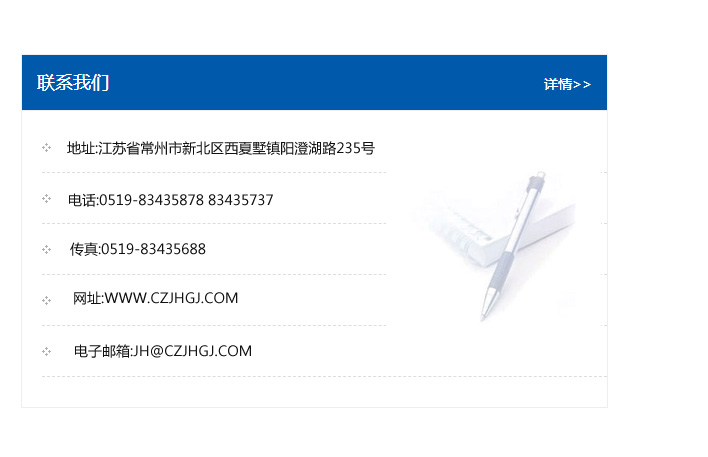 傳真:0519-83435688    郵編:213135    網址:WWW.czjhgj_com.shi-qi.com    電子郵箱:JH@czjhgj_com.shi-qi.com